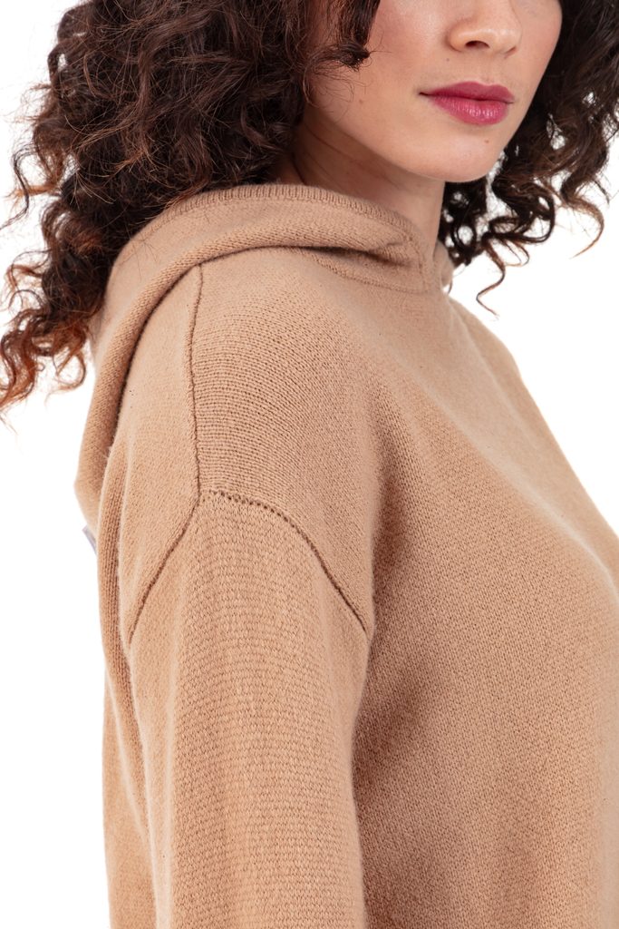 Warm and modern, the PRUNE women’s jumper revisits the sportswear spirit in a luxurious version. Knitted in 100% 4-ply yak, it offers a dense, soft knit, perfect for winter. With its hood and long sleeves, this model delights with its comfort and chic, relaxed look.
