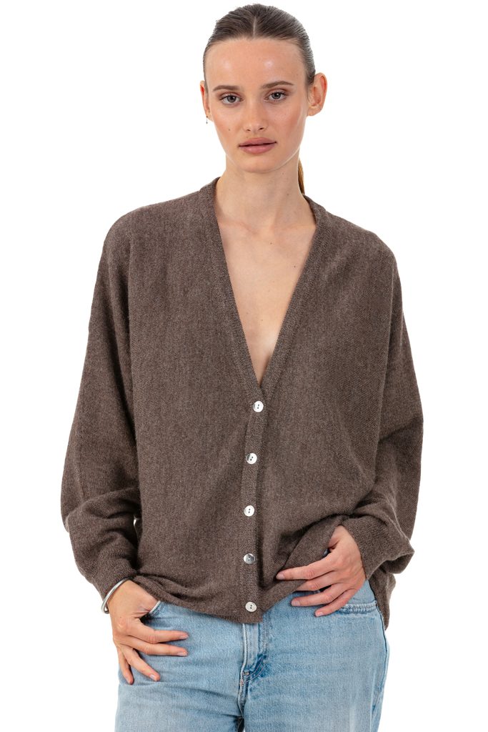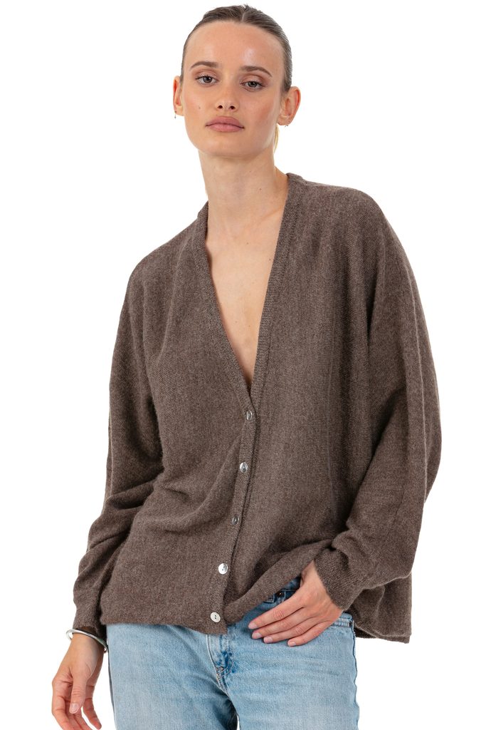 Delicate and feminine, the PATRIZIA women’s cardigan in baby alpaca is a refined and comfortable essential. Knitted in 100% 2-ply baby alpaca, it enchants with its loose cut, V-neck, and batwing sleeves that bring modernity and fluidity. It combines lightness with natural warmth.