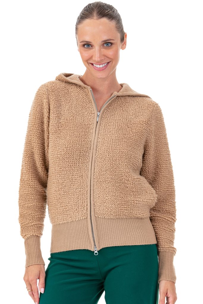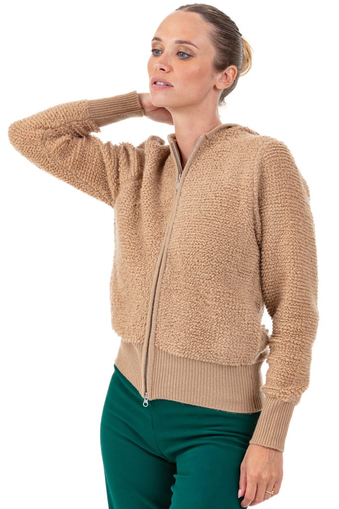 This zipped cashmere cardigan pairs ideally with jeans and trainers for a chic casual look. Its hood and boucle texture give it a modern, sporty feel while remaining elegant – the perfect piece that combines warmth and lightness.