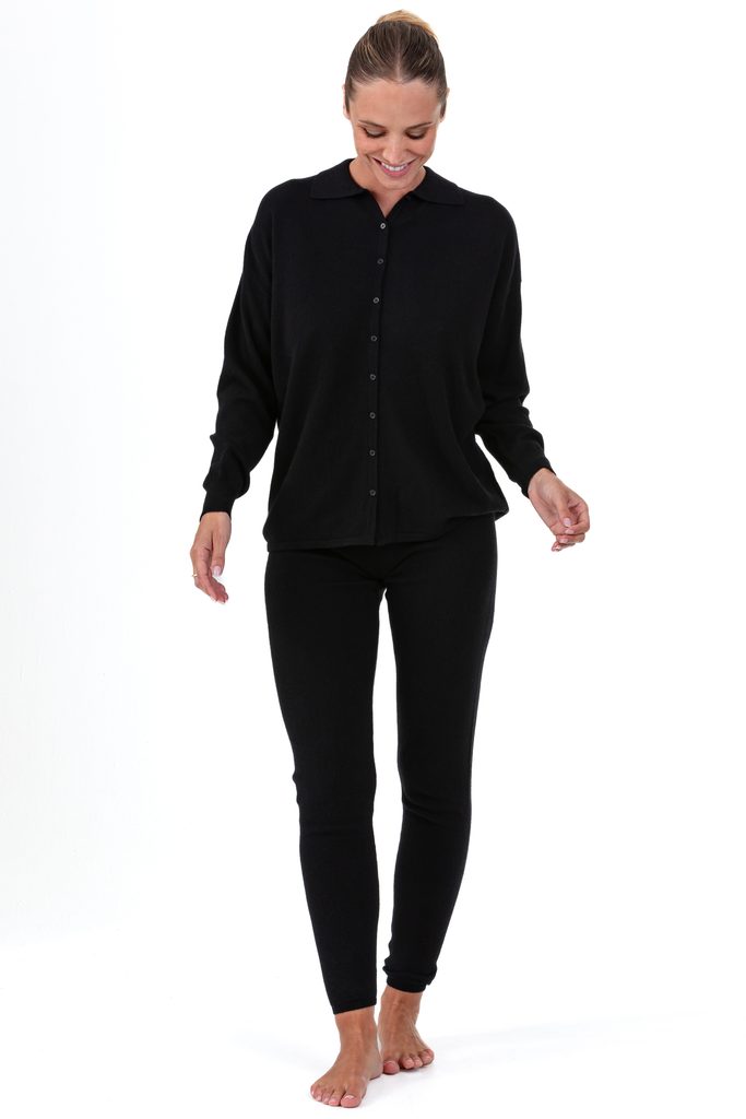 Chic and comfortable, the PIRAMISU pyjama set combines softness with refinement. Knitted in 100% 2-ply cashmere, it consists of slim-fit leggings, inspired by the Xelina model, and a loose-cut buttoned shirt top.