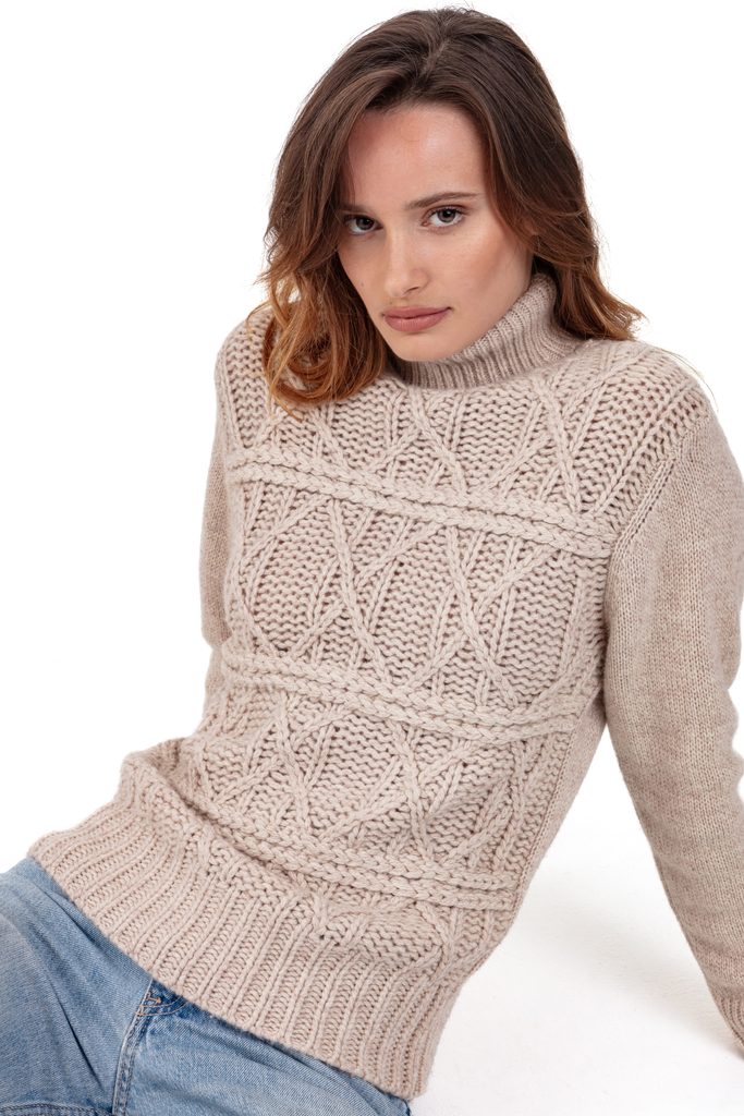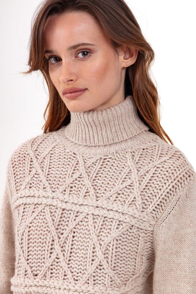 Unique and structured, the POETI women’s jumper stands out with its graphic design. Knitted in 100% camel hair, it combines a 16-ply cable knit on the front with a lighter 6-ply knit at the back and sleeves. This contrast gives it a bold, architectural style.