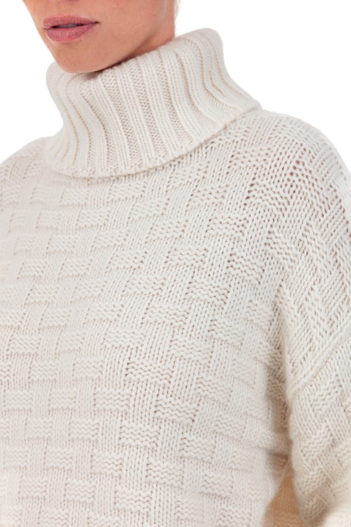 Its ribbed roll neck and long sleeves are enhanced by an all-over geometric cable pattern, giving it a graphic and sophisticated look.