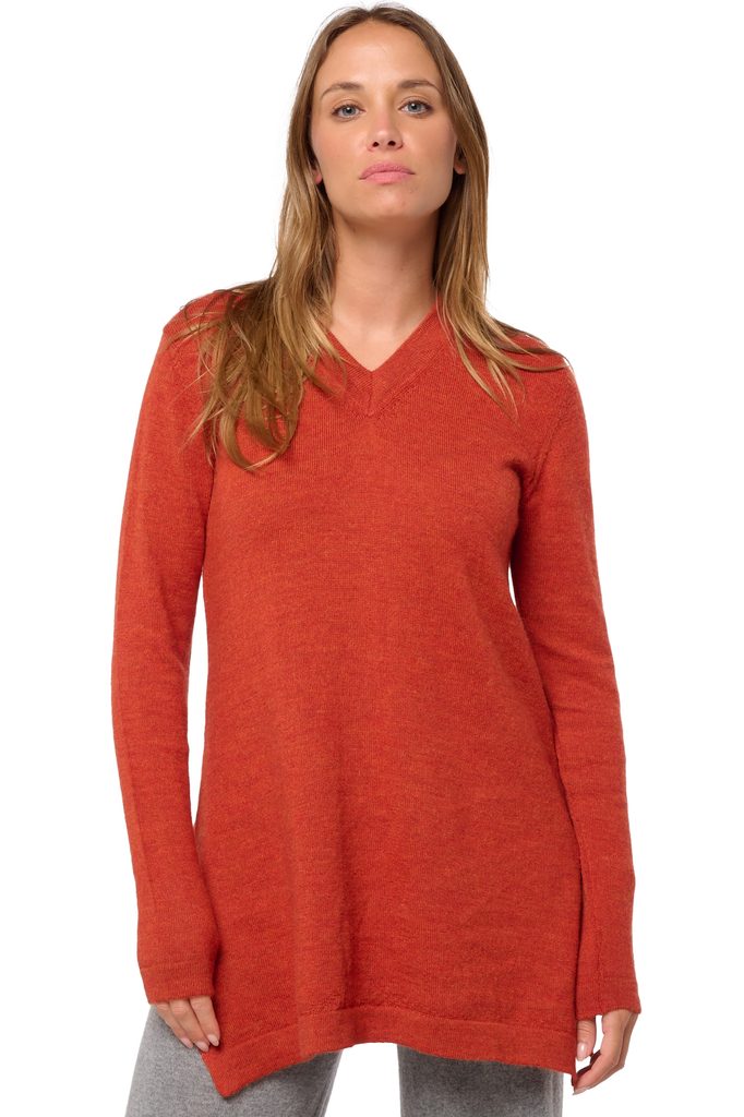 Tunikowy sweter z dekoltem w szpic i dwoma rozcięciami po bokach.